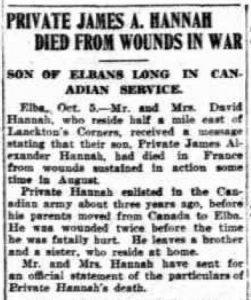 James Alexander Hannah had family ties to Elba (Genesee County), New York, but he was a lifelong Canadian citizen and is most appropriately honored as a Canadian soldier.