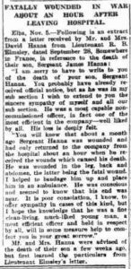 Tragically, Serjeant Hannah had just been sent back to his unit from the hospital when he received his mortal wounds. In a letter to Hannah’s parents dated September 28, 1918, excerpted in the November 5, 1918 Batavia Daily News, Lt. R.B. Elmsley, Hannah’s section officer, wrote: “You will know that about a month ago Serjeant Hannah was wounded and had only returned to the company from the hospital about an hour when he received the wound which caused his death. He was wounded in the leg, back and abdomen, the latter being the fatal wound. I helped to bandage him up and place him in an ambulance. He was conscious and seemed to know that his end was near. . . . I hope the knowledge that he was a fine clean-living, much-liked young man, a most efficient officer and held in respect by all, will in some measure help to comfort you in your great sorrow.”