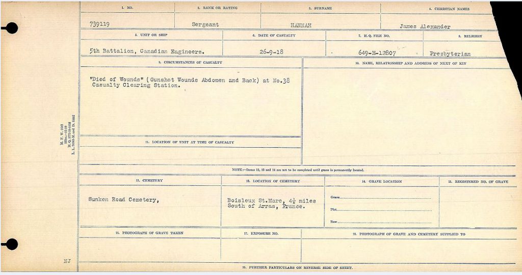 Serjeant Hannah arrived in France with his original unit, the Canadian 3rd Division’s 123rd Canadian Pioneer Battalion, on March 10, 1917, and spent the remainder of the war in the muddy, trench-riddled, war-torn terrain of the Somme, between Arras in the northwest and the Canal du Nord several miles east. In June, 1918, his unit was reorganized and became part of the 2nd Division’s 5th Battalion, Canadian Engineers. Building and repairing trench systems and water supply lines and creating and maintaining roads for the movement of troops and artillery, the engineers worked under horrific conditions, often under heavy fire from machine guns and artillery. Serjeant Hannah was wounded twice, once near Bully-Grenay on August 29, 1917, and again about a year later in August 1918, before being wounded a third time, fatally.